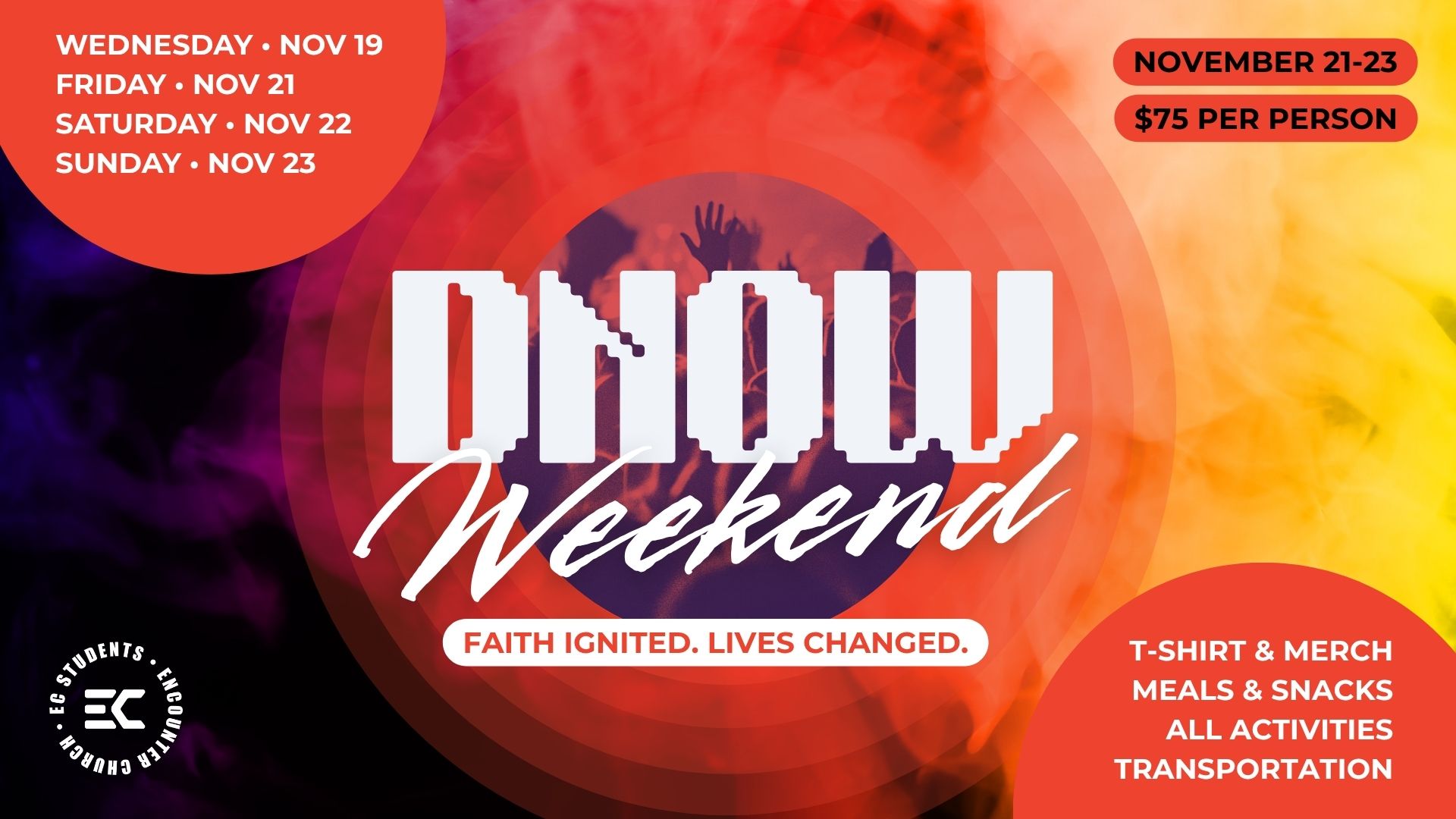DNOW (Disciple Now) is a weekend designed to help students experience God, connect with peers, and discover their unique purpose. Through worship, Bible study, community, and service, students are equipped to live out their faith long after the weekend ends.