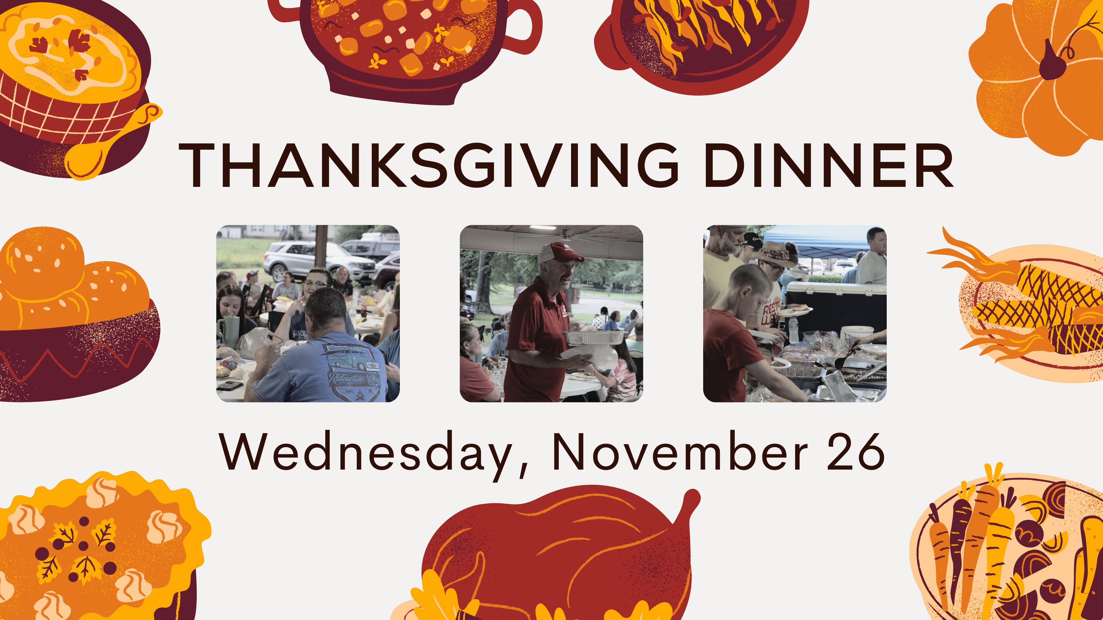Bring your family and appetite as we gather to give thanks and enjoy a warm meal together as a church family at the church pavilion.